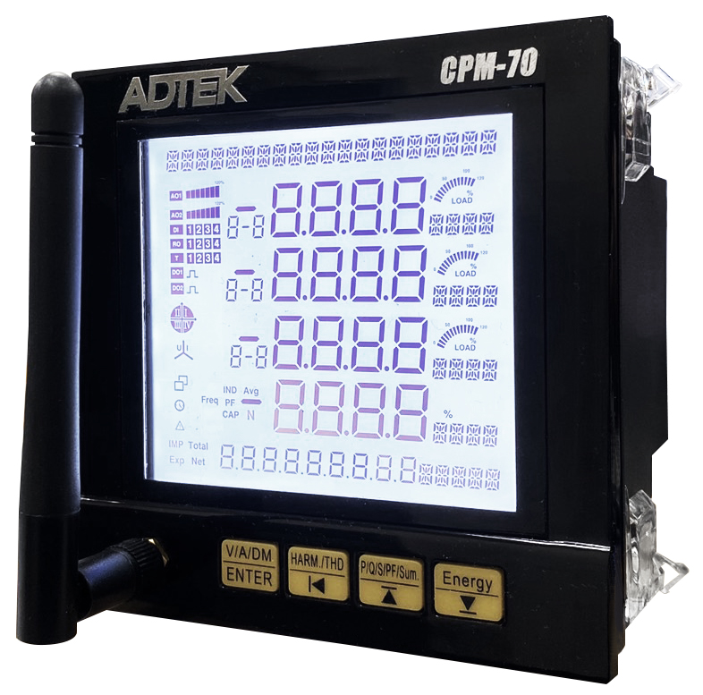 CPM-70 multi-function power quality analysis meter provides a variety of single-phase and three-phase high-precision power parameter measurement, and has 4 sets of digital inputs, 2 sets of relay outputs and RS-485 Modbus RTU communication port and other complete interfaces and functions. It can measure the 2~31th individual harmonics of voltage and current, and can display the accumulated electricity bill and CO2 carbon emission, which is suitable for the needs of power monitoring, management and power quality analysis. It also has a TOU (time-of-use) function and a 2MB Flash recording capacity, allowing users to record data for a long time. Innovative power meter AI calculation function, which can perform automatic wiring adjustment (Auto wiring change will be had condition limit , please refer Auto wiring change will be had condition limit , please refer to operation manual) to operation manual). FCC and CE certification